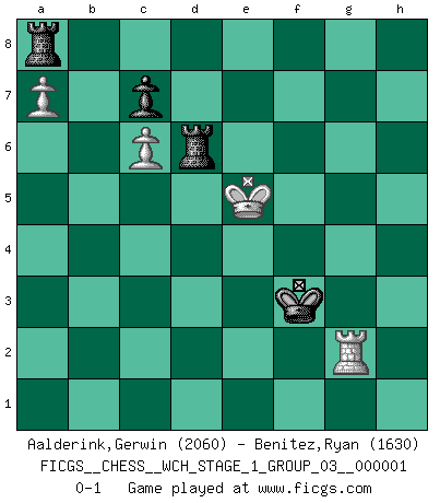 Last move : 0-1 2006 November 28 15:7:24 [Event "FICGS__CHESS__WCH_STAGE_1_GROUP_03__000001"] [Site "FICGS"] [Date "2006.07.01"] [Round "1"] [White "Aalderink,Gerwin"] [Black "Benitez,Ryan"] [Result "0-1"] [WhiteElo "2060"] [BlackElo "1630"] 1.Nf3 Nf6 2.b3 d5 3.Bb2 Bg4 4.e3 e6 5.Be2 Nc6 6.O-O Bd6 7.d3 O-O 8.Nbd2 h6 9.a3 a5 10.c4 Re8 11.Qc2 Qe7 12.Rfc1 Nd7 13.Qc3 Qf6 14.Qxf6 Nxf6 15.Bxf6 gxf6 16.d4 Red8 17.Bd3 Bh5 18.Kf1 Bg6 19.Ke2 Kg7 20.h3 f5 21.g3 dxc4 22.bxc4 b6 23.g4 Kf6 24.Ra2 a4 25.gxf5 exf5 26.c5 bxc5 27.dxc5 Be7 28.Bb5 Na5 29.Bxa4 Rd5 30.c6 Rad8 31.Rc3 Kg7 32.Bb3 R5d6 33.Nd4 Bf6 34.N2f3 Bh5 35.Rc5 Rxd4 36.Rxa5 Rh4 37.Rxf5 Rxh3 38.a4 Bg6 39.Bc2 Bxf5 40.Bxf5 Rh5 41.e4 Rh1 42.Ne1 h5 43.Nd3 h4 44.Nf4 Be5 45.Nd3 Bd6 46.Bg4 h3 47.a5 f5 48.Bf3 Rg1 49.exf5 Re8+ 50.Kd2 Kf6 51.a6 Ra8 52.a7 h2 53.Ra5 h1Q 54.Bxh1 Rxh1 55.Kc3 Rb1 56.Kc4 Rb6 57.Kd5 Kxf5 58.f3 Rb1 59.f4 Bxf4 60.Kd4 Kg4 61.Ke4 Bh2 62.Ne5+ Bxe5 63.Kxe5 Rd1 64.Ra2 Rd6 65.Rg2+ Kf3 0-1 Reti Opening Kingside Castling by player White (move 6) Kingside Castling by player Black (move 7) Promotion Queen by player Black (move 53) 10 pieces endgame at move 59 : White KRNPP , Black KRRBP WHITE : King + 1 Rook 1 Knight 2 Pawns BLACK : King + 2 Rooks 1 Bishop 1 Pawn 9 pieces endgame at move 62 : White KRPP , Black KRRBP WHITE : King + 1 Rook 2 Pawns BLACK : King + 2 Rooks 1 Bishop 1 Pawn 8 pieces endgame at move 63 : White KRPP , Black KRRP WHITE : King + 1 Rook 2 Pawns BLACK : King + 2 Rooks 1 Pawn Player Black won this chess game. Follow this game move after move (download)We like to think. (Gary Kasparov) Ich tröste mich mit dem Vergnügen, daß Schachfans, Zuschauer und Leser glücklich sind, wenn ein Großmeister etwas riskiert, statt nur Klötzchen zu schieben. (Mikhail Nekhemyevich Tal) La caracteristica mas importante en la posición del Ajedrez es la actividad de las piezas. Esto es absolutamente fundamental en todas las fases del juego: Apertura, Juego Medio y especialmente Finales. La limitación primordial en la actividad de una pieza, es la estructuración de los Peones. (Michael Stean) C'est une question de caractère, Beaucoup de gens perdent leur motivation très vite. D'autres, ils sont rares, peuvent la conserver très longtemps. J'aime les échecs, encore aujourd'hui je suis heureux d'analyser des parties. J'aime toujours gagner, je déteste encore perdre. Bien jouer est important pour mon intégrité intellectuelle et morale. Et puis les échecs vivent en ce moment une période historique grâce à Internet. Ils se développent dans les systèmes éducatifs à travers le monde. Ils sortent de leur ghetto, et c'est mon rôle de mener à bien cette révolution. (Gary Kasparov) Man with more than one clock never knows what time it is. (Chinese thought)