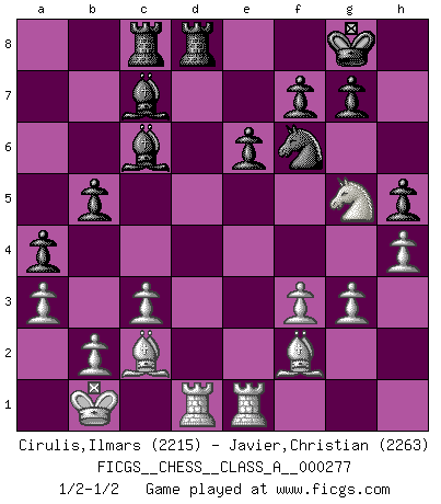 Last move : 1/2-1/2 2024 April 4 12:50:59 [Event "FICGS__CHESS__CLASS_A__000277"] [Site "FICGS"] [Date "2024.02.20"] [Round "1"] [White "Cirulis,Ilmars"] [Black "Javier,Christian"] [Result "1/2-1/2"] [WhiteElo "2215"] [BlackElo "2263"] 1.e4 c5 2.d4 cxd4 3.Qxd4 Nc6 4.Qe3 Nf6 5.Nc3 d5 6.exd5 Nxd5 7.Nxd5 Qxd5 8.Qb3 Be6 9.Qxd5 Bxd5 10.Be3 e6 11.a3 Ne5 12.Ne2 a6 13.O-O-O h5 14.Nf4 Bc6 15.h4 Ng4 16.Bb6 Rc8 17.f3 Nf6 18.Be2 Be7 19.Kb1 O-O 20.Bf2 Rfe8 21.Rhe1 Bd8 22.Nh3 a5 23.Bd3 Kf8 24.Bd4 Bc7 25.Bf2 a4 26.Ng5 Ba5 27.c3 Red8 28.Bc2 Bc7 29.Bc5+ Kg8 30.Bf2 b5 31.g3 1/2-1/2 Follow this game move after move (download)What would Chess be without silly mistakes ? (Kurt Richter) Es hat in meinem Leben Zeiten gegeben, da ich sehr nahe daran war zu glauben, daß ich auch nicht eine einzige Schachpartie verlieren könnte. (José Raúl Capablanca) Estaba muy claro de que el punto vulnerable del Gran Maestro Americano (Bobby Fischer) radicaba en las posiciones de doble filo, colgantes, irracionales, donde el siempre falló en encontrar un triunfo aún en una posición de clara victoria. (Efim Geller) Le joueur d'Echecs qui veut atteindre le top est obligé de développer son propre credo créatif. Alexeï Stepanovicth Souétine. Il est facile d'écrire des livres ! Ce qui est difficile, c'est de jouer ! (Alexeï Stepanovicth Souétine) The meaning of life is that it is to be lived, and it is not to be traded and conceptualized and squeezed into a pattern of systems. (Bruce Lee)