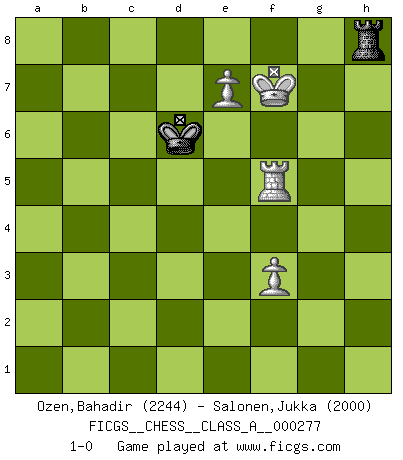 Last move : 1-0 2024 May 24 7:55:25 [Event "FICGS__CHESS__CLASS_A__000277"] [Site "FICGS"] [Date "2024.02.20"] [Round "1"] [White "Ozen,Bahadir"] [Black "Salonen,Jukka"] [Result "1-0"] [WhiteElo "2244"] [BlackElo "2000"] 1.d4 d5 2.c4 e6 3.Nc3 Nf6 4.cxd5 exd5 5.Bg5 c6 6.e3 Be7 7.Bd3 O-O 8.Qc2 Nbd7 9.Nge2 Re8 10.O-O h6 11.Bh4 Ne4 12.Bxe7 Qxe7 13.Bxe4 dxe4 14.Rfd1 Nf6 15.h3 Bd7 16.Rd2 b6 17.d5 cxd5 18.Nxd5 Nxd5 19.Rxd5 Rac8 20.Nc3 Be6 21.Rd4 f5 22.Qa4 Rc5 23.Rad1 Ra5 24.Qc2 Rc8 25.a3 Kh7 26.Rd6 Rac5 27.R1d4 R5c7 28.Qe2 Qf7 29.Qb5 Rc5 30.Qa4 Qe7 31.Ne2 Rc4 32.b4 Rxd4 33.Rxd4 Bc4 34.Nf4 Rc7 35.Qd1 Bf7 36.g3 Qe5 37.Kg2 g5 38.Ne2 Bc4 39.Rd7+ Kg8 40.Rd8+ Kg7 41.Qd4 Kf6 42.Rd6+ Be6 43.h4 Rf7 44.Rc6 Qxd4 45.Nxd4 Re7 46.h5 Ke5 47.g4 fxg4 48.a4 Re8 49.a5 bxa5 50.bxa5 g3 51.Kxg3 Kd5 52.Ra6 Re7 53.Kg2 Re8 54.Nxe6 Rxe6 55.Rxa7 Rd6 56.Rb7 Ra6 57.Rb5+ Kc4 58.Rb6 Rxa5 59.Rxh6 g4 60.Rd6 Rxh5 61.Rd4+ Kc3 62.Rxe4 Kd3 63.Rxg4 Ke2 64.e4 Re5 65.Kg3 Rb5 66.f3 Ke3 67.Rg6 Re5 68.Kg4 Ra5 69.Rg5 Ra8 70.e5 Re8 71.Rf5 Rg8+ 72.Kh5 Re8 73.Kg6 Kd4 74.Kf6 Kd5 75.Kf7 Rh8 76.e6 Kd6 77.e7 1-0 Follow this game move after move (download)The tactician must know what to do whenever something needs doing; the strategist must know what to do when nothing needs doing. (Savielly Tartakover) Schach ist wie eine schöne Frau, zu der wir ständig zurückkehren, gleichviel, wie oft sie uns zurückweist. (Anonymous) Aquel que teme a un Peón de Reina aislado, debería de retirarse del Ajedrez. (Siegbert Tarrasch) Plusieurs personnes se sont demandées comment Tal faisait pour gagner... En fait, c'est très simple ! Il met ses pièces au centre de l'échiquier et les sacrifie quelque part ! (David Bronstein) To err is human, to shift the blame on someone else is tactical. (Mladen Jankovic)