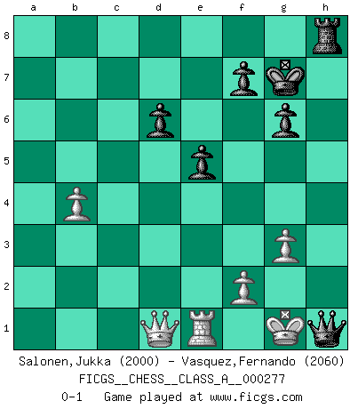 Last move : 0-1 2024 October 12 6:56:51 [Event "FICGS__CHESS__CLASS_A__000277"] [Site "FICGS"] [Date "2024.02.20"] [Round "1"] [White "Salonen,Jukka"] [Black "Vasquez,Fernando"] [Result "0-1"] [WhiteElo "2000"] [BlackElo "2060"] 1.d4 Nf6 2.c4 g6 3.Nc3 Bg7 4.e4 d6 5.Nf3 O-O 6.Be2 e5 7.O-O Na6 8.Re1 c6 9.Be3 Re8 10.d5 Ng4 11.Qd2 Nxe3 12.Qxe3 Qe7 13.Rab1 Qf8 14.b4 Nc7 15.h4 cxd5 16.cxd5 Bd7 17.h5 Bh6 18.Qd3 Rec8 19.hxg6 hxg6 20.g3 Ne8 21.Kg2 Nf6 22.Rh1 Rc7 23.Nd2 b5 24.Nb3 Rac8 25.Nxb5 Bxb5 26.Qxb5 Nxe4 27.Rbe1 Nc3 28.Qa5 Nxe2 29.Rxe2 Kg7 30.Qa6 Qd8 31.Nd2 Bxd2 32.Rxd2 Rc3 33.Rd3 Rc1 34.Rxc1 Rxc1 35.Qa4 Qc8 36.Rd1 Rc3 37.Qxa7 Qg4 38.Re1 Qf3+ 39.Kg1 Ra3 40.Qb6 Rxa2 41.Qe3 Qxd5 42.Qc3 Ra8 43.Qc2 Rh8 44.Qd1 Qh1+ 0-1 Follow this game move after move (download)Capture of the adverse King is the ultimate but not the first object of the game. (William Steinitz) Moralische Siege zählen nicht. (Savielly Grigorievitsch Tartakower) Solo el jugador con la iniciativa tiene el derecho a atacar. (Wilhelm Steinitz) RxDa4 pat (...) You know what they say : You lie down with the Devil, you wake up in Hell. (Horatio Caine, C.S.I. Miami)