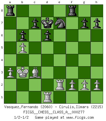 Last move : 1/2-1/2 2024 June 17 2:24:42 [Event "FICGS__CHESS__CLASS_A__000277"] [Site "FICGS"] [Date "2024.02.20"] [Round "1"] [White "Vasquez,Fernando"] [Black "Cirulis,Ilmars"] [Result "1/2-1/2"] [WhiteElo "2060"] [BlackElo "2215"] 1.e4 e5 2.Nf3 Nc6 3.d4 exd4 4.Nxd4 Qf6 5.Nb5 Bc5 6.Qd2 Bb6 7.N1c3 Nge7 8.Qf4 Qxf4 9.Bxf4 d6 10.Be3 Ba5 11.a3 a6 12.b4 axb5 13.bxa5 Rxa5 14.Nxb5 Kd8 15.Be2 f5 16.exf5 Nxf5 17.Bg5+ Kd7 18.Bd2 Ra4 19.O-O-O b6 20.Kb2 Ba6 21.Rhe1 Ra8 22.c4 Bxb5 23.cxb5 Ncd4 24.Bb4 Nxe2 25.Rxe2 Rf8 26.Kb3 R4a8 27.Bc3 Ne7 1/2-1/2 Follow this game move after move (download)If cunning alone were needed to excel, women would be the best Chess players. (Albin) Zeige mir drei Eröffnungsvarianten und ich beweise dir, dass zwei davon inkorrekt sind. (Emanuel Lasker) Aunque la mayoría de la gente disfruta observar las partidas de los grandes Maestros de ataque, algunos de los jugadores mas notables en la historia han sido los jugadores silenciosos posicionales. Lentamente ellos te aplastan despojandote de tu espacio, congestionando tus piezas y dejandote virtualmente sin nada que hacer. (Yasser Seirawan) Les réformistes prétendent que les progrès de la théorie conduiront à la disparition des échecs, et qu'il faut, pour leur rendre vie, en remanier les règles. En réalité, qu'exprime cette affirmation? Le mépris de l'intuition, de l'imagination et de tous les autres éléments qui font des échecs un art. (Alexander Alekhine) Beep ! (R2D2 in Star Wars ep.3)