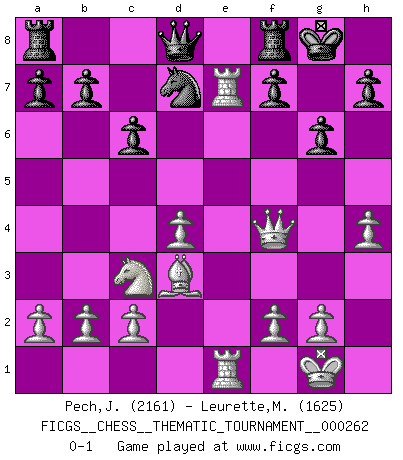 Last move : 0-1 2024 June 11 21:28:47 [Event "FICGS__CHESS__THEMATIC_TOURNAMENT__000262"] [Site "FICGS"] [Date "2024.02.21"] [Round "1"] [White "Pech,Jaroslav"] [Black "Leurette,Marc-Antoine"] [Result "0-1"] [WhiteElo "2161"] [BlackElo "1625"] 1.e4 d5 2.exd5 Qxd5 3.Nc3 Qd6 4.d4 Nf6 5.Nf3 Bg4 6.h3 Bxf3 7.Qxf3 c6 8.Bf4 Qe6+ 9.Be2 Nbd7 10.O-O g6 11.Rfe1 Nb6 12.Bd3 Qd7 13.Be5 Bg7 14.Bxf6 O-O 15.Rxe7 Qc8 16.Bxg7 Kxg7 17.Rae1 Kg8 18.h4 Qd8 19.Qf4 Nd7 0-1 Follow this game move after move (download)A sacrifice is best refuted by accepting it. (Wilhelm Steinitz) Der Umstand, daß uns eine 7 Stunden Zeitkontrolle ermöglicht eine großartige, tiefe Partie zu spielen, ist für die Massenmedien nicht weiter von Bedeutung. (Alexej Shirov) Al jugar al Ajedrez entonces, podemos aprender: Primero: Previsión... Segundo: Prudencia... Tercero: Cautela... Y al final, aprendemos del Ajedrez el hábito de no ser desanimados por apariencias malas presentes en el estado de nuestros asuntos, el hábito de la esperanza por una oportunidad favorable y la perseveración de los secretos de los recursos. (Benjamin Franklin) Ce qui est bien, c'est d'avoir tout un tas de pièces en prise : l'adversaire ne peut en prendre qu'une à la fois. Cité par Thierry Audin. Without deviation from the norm, progress is not possible. (Frank Zappa)