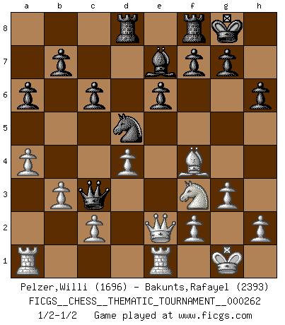 Last move : 1/2-1/2 2024 June 26 8:31:28 [Event "FICGS__CHESS__THEMATIC_TOURNAMENT__000262"] [Site "FICGS"] [Date "2024.02.21"] [Round "1"] [White "Pelzer,Willi"] [Black "Bakunts,Rafayel"] [Result "1/2-1/2"] [WhiteElo "1696"] [BlackElo "2393"] 1.e4 d5 2.exd5 Qxd5 3.Nc3 Qd6 4.d4 Nf6 5.Nf3 c6 6.Be2 Bg4 7.O-O Nbd7 8.Ng5 Bf5 9.a4 h6 10.Nf3 e6 11.b3 Qc7 12.Bd3 Bxd3 13.Qxd3 Be7 14.g3 Rd8 15.Qe2 O-O 16.Re1 a6 17.Bf4 Qa5 18.Ne4 Nxe4 19.Qxe4 Nf6 20.Qe5 Qc3 21.Qe2 Nd5 1/2-1/2 Follow this game move after move (download)Chess is thirty to forty percent psychology. You don't have this when you play a computer. I can't confuse it. (Judith Polgar) Ich verstehe Aljechins Kombinationen ganz gut; aber woher er diese Angriffschancen bekommt und wie er die Eröffnung behandelt das ist für mich ein Buch mit sieben Siegeln. (Rudolf Spielmann) El Ajedrez es un juego terrible. Si no dominas el centro, tu oponente tiene una posición mas libre. Si tu tienes el centro, entonces realmente tienes algo de que preocuparte. (Siegbert Tarrasch) Toute estimation doit être constamment réévaluée. (Jacob Estrin) Tree pose grows confidence. It roots me to this world. (Terri Guillemets)