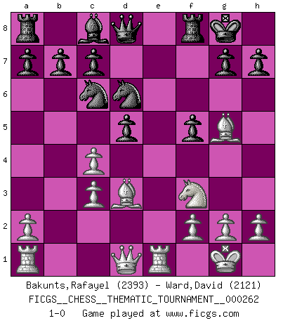 Last move : 1-0 2024 April 20 4:27:7 [Event "FICGS__CHESS__THEMATIC_TOURNAMENT__000262"] [Site "FICGS"] [Date "2024.02.21"] [Round "1"] [White "Bakunts,Rafayel"] [Black "Ward,David"] [Result "1-0"] [WhiteElo "2393"] [BlackElo "2121"] 1.e4 d5 2.exd5 Qxd5 3.Nc3 Qd6 4.d4 Nf6 5.Nf3 Nc6 6.Nb5 Qd8 7.c4 e6 8.Be2 Bb4+ 9.Nc3 O-O 10.O-O Bxc3 11.bxc3 Ne4 12.Bd3 f5 13.Re1 Nd6 14.d5 exd5 15.Bg5 1-0 Follow this game move after move (download)I like the moment when I break a man's ego. (Bobby Fischer) Ich habe Putins Aufstieg an die Macht beobachtet und seine Politik, die demokratischen Institutionen meines Landes zu zerstören. (Garry Kasparov) El Ajedrez es un mar en el cual un mosquito puede beber y un elefante puede bañarse. (Refrán Hindú) Le jeu d'échecs fait naître et fortifie en nous plusieurs qualités précieuses dans le cours de l'existence, telles que la prévoyance, la circonspection, la prudence, et la persévérance. (Benjamin Franklin - 1783, la morale des échecs) Only sick music makes money today. (Friedrich Nietzsche)