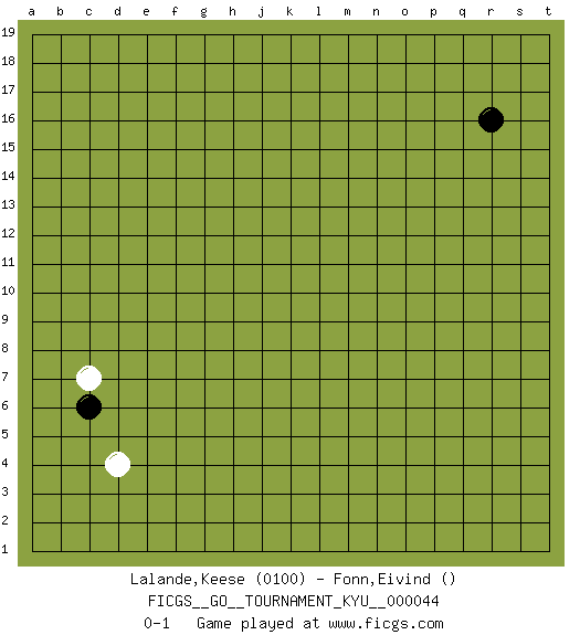 Last move : 0-1 2007 October 17 12:58:42 [Event "FICGS__GO__TOURNAMENT_KYU__000044"] [Site "FICGS"] [Date "2007.09.13"] [Round "1"] [Black "Lalande,Keese"] [White "Fonn,Eivind"] [Result "0-1"] [Rating 1 "0100"] 1.r16 d4 2.c6 c7 0-1 This go game has been lost on time (started : 2007.09.13 13:31:26) Here are the names of the openings (joseki) played in the four corners : Corner d4 : d4 c6 Hoshi (Hwajeom, Seongjeom, Xingwei`) 4-4 Point. The star or hoshi (4-4) point, emphasizing influence at the potential expense of territory. Ikken Kakari (Hankan Keolch'im, Yi Gua`jiao~, 1-Space Low Approach). Black 2 is the standard approach move to the 4-4. Player White won this Go (weiqi, baduk) game. Follow this game move after move (download)At the head of two stones in a row, play hane. (Anonymous) Only sick music makes money today. (Friedrich Nietzsche)