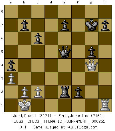 Last move : 0-1 2025 March 7 22:43:48 [Event "FICGS__CHESS__THEMATIC_TOURNAMENT__000262"] [Site "FICGS"] [Date "2024.02.21"] [Round "1"] [White "Ward,David"] [Black "Pech,Jaroslav"] [Result "0-1"] [WhiteElo "2121"] [BlackElo "2161"] 1.e4 d5 2.exd5 Qxd5 3.Nc3 Qd6 4.d4 Nf6 5.Nf3 c6 6.Ne5 Nbd7 7.Bf4 Nd5 8.Nxd5 Qxd5 9.Be2 Nxe5 10.dxe5 Qxg2 11.Bf3 Qh3 12.Qe2 g6 13.O-O-O Bh6 14.Bxh6 Qxh6+ 15.Kb1 Qf4 16.h4 Bf5 17.h5 O-O 18.Rhg1 Rad8 19.Rh1 Rxd1+ 20.Rxd1 a5 21.Rd2 a4 22.a3 Kg7 23.Rd1 Ra8 24.Rg1 Ra5 25.Re1 Rc5 26.Be4 Rxe5 27.f3 Bxe4 28.fxe4 f5 29.Qd3 Rxe4 30.h6+ Kf6 31.Rh1 Qe5 32.Qd2 f4 33.Rf1 g5 34.Qf2 Kg6 35.Qd2 Kxh6 36.Qd1 Re2 37.Rh1+ Kg7 38.Qg1 f3 39.Qg4 f2 0-1 This chess game has been lost on time (started : 2024.02.21 7:33:34) Follow this game move after move (download)Life is like a game of Chess, changing with each move. (Chinese proverb) Computer sind die einzigen Gegner, die nicht immer eine Ausrede auf Lager haben, wenn sie gegen mich verlieren. (Robert James Fischer) Fischer es el jugador mas fuerte del mundo. De hecho, el jugador mas fuerte que jamas haya existido. (Larry Evans) Echiquier : carré parfait, comme la Jérusalem nouvelle décrite par l'auteur de l'Apocalypse, huit cases sur huit, exaltation du chiffre 4, symbole du cosmos aux quatre horizons... où le noir et le blanc, l'ombre et la lumière, le mal et le bien s'entremêlent et se conjuguent. (Robert Couffignal, Le Gambit du poète) Pushing plastic is for the many, pushing virtual pieces is for the fewer, pushing wood is for the very few. (Normajean Yates)