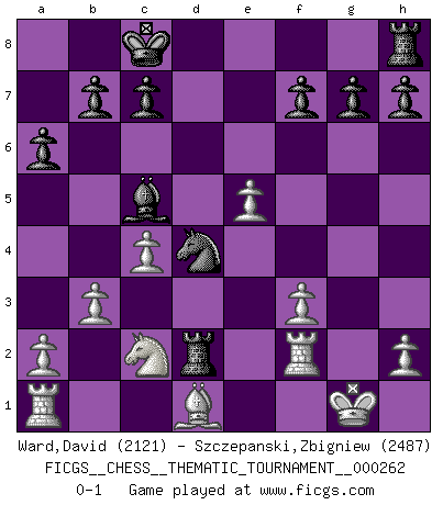 Last move : 0-1 2024 March 29 17:42:47 [Event "FICGS__CHESS__THEMATIC_TOURNAMENT__000262"] [Site "FICGS"] [Date "2024.02.21"] [Round "1"] [White "Ward,David"] [Black "Szczepanski,Zbigniew"] [Result "0-1"] [WhiteElo "2121"] [BlackElo "2487"] 1.e4 d5 2.exd5 Qxd5 3.Nc3 Qd6 4.d4 Nf6 5.Nf3 Nc6 6.Nb5 Qd8 7.Be2 a6 8.Na3 e5 9.dxe5 Qxd1+ 10.Bxd1 Ne4 11.O-O Be6 12.b3 O-O-O 13.Bb2 Bc5 14.c4 Bg4 15.Nc2 Nxf2 16.Rxf2 Bxf3 17.gxf3 Rd2 18.Bd4 Nxd4 0-1 Follow this game move after move (download)A bad plan is better than none at all. (Frank Marshall) Du musst nicht gut spielen, es reicht, wenn du besser spielst als dein Gegner. (Anonymous) Todos los Maestros de Ajedrez fueron un día unos principiantes. (Chernev) Il a essayé de se convaincre qu'il pourrait empêcher toutes les erreurs et ne jamais perdre. L'horreur ! Gary Kasparov au sujet de Robert Fischer. Wisdom begins at the end. (Daniel Webster)