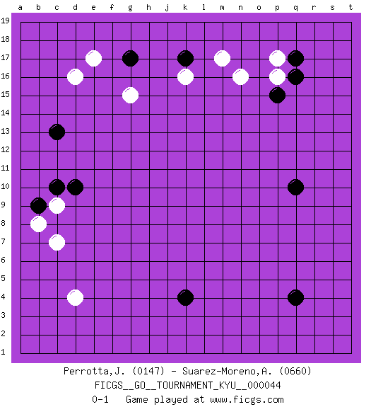 Last move : 0-1 2007 October 28 19:37:49 [Event "FICGS__GO__TOURNAMENT_KYU__000044"] [Site "FICGS"] [Date "2007.09.13"] [Round "1"] [Black "Perrotta,John Zach"] [White "Suarez-Moreno,Alejandro"] [Result "0-1"] [Rating 1 "0147"] [Rating 2 "0660"] 1.q16 d16 2.q4 d4 3.g17 e17 4.k4 k16 5.k17 m17 6.d10 c7 7.c13 g15 8.q10 p17 9.q17 p16 10.p15 n16 11.b9 c9 12.c10 b8 0-1 This go game has been lost on time (started : 2007.09.13 13:31:26) Here are the names of the openings (joseki) played in the four corners : Corner d16 : d16 g17 Hoshi (Hwajeom, Seongjeom, Xingwei`) 4-4 Point. The star or hoshi (4-4) point, emphasizing influence at the potential expense of territory. Nikken Kakari (Dukan Keolch'im, E`r Gua`jiao~, 2-Space Low Approach). White typically answers by 7-3 or 3-5 (which is not joseki). Corner q16 : q16 m17 Hoshi (Hwajeom, Seongjeom, Xingwei`) 4-4 Point. The star or hoshi (4-4) point, emphasizing influence at the potential expense of territory. Player White won this Go (weiqi, baduk) game. Follow this game move after move (download)Take the cutting stone on the second line. (Anonymous) Dave, my mind is going. I can feel it. (HAL 9000 in 2001, a space odyssey)
