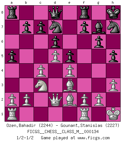 Last move : 1/2-1/2 2024 March 15 7:51:42 [Event "FICGS__CHESS__CLASS_M__000134"] [Site "FICGS"] [Date "2024.02.25"] [Round "1"] [White "Ozen,Bahadir"] [Black "Gounant,Stanislas"] [Result "1/2-1/2"] [WhiteElo "2244"] [BlackElo "2227"] 1.d4 Nf6 2.c4 g6 3.Nc3 Bg7 4.e4 d6 5.Nf3 O-O 6.Be2 e5 7.O-O Bg4 8.d5 a5 9.h3 Bxf3 10.Bxf3 Kh8 11.Bg5 h6 12.Be3 Nbd7 13.Qd2 Nh7 14.Bd1 h5 15.Kh1 Nb6 16.Be2 Nd7 17.Bd1 Nb6 18.Be2 Nd7 1/2-1/2 Follow this game move after move (download)A sacrifice is best refuted by accepting it. (Wilhelm Steinitz) Kasparov stellt für gewöhnlich die Regeln auf und bricht sie dann selbst wieder. (Alexej Shirov) Después de la respuesta de las negras a 1.e4 con 1..e5, se quedan siempre tratando de entrar dentro del juego. (Howard Staunton) Même si l'adversaire joue le coup analysé précédemment, recommencez l'analyse en voyant la nouvelle position. Première règle de Blumenfeld A cynic is a man who knows the price of everything but the value of nothing. (Oscar Wilde)