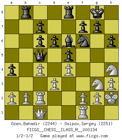 Last move : 1/2-1/2 2024 March 6 15:36:40 [Event "FICGS__CHESS__CLASS_M__000134"] [Site "FICGS"] [Date "2024.02.25"] [Round "1"] [White "Ozen,Bahadir"] [Black "Osipov,Sergey"] [Result "1/2-1/2"] [WhiteElo "2244"] [BlackElo "2251"] 1.e4 e5 2.Nf3 Nc6 3.Bc4 Nf6 4.d3 Bc5 5.c3 d6 6.O-O O-O 7.h3 a5 8.Re1 h6 9.Nbd2 Be6 10.Bb5 Qb8 11.Nf1 Qa7 12.Re2 a4 13.Ng3 Qa5 14.Bxc6 bxc6 15.Rc2 Rfe8 16.Bd2 Qa6 17.c4 Qb6 18.Qe2 Bb4 19.Rf1 Bxd2 20.Qxd2 Rab8 21.Kh2 Qc5 22.Nh4 Qb4 23.Qc1 Qc5 24.Qd2 Qb4 25.Qc1 Qc5 1/2-1/2 Follow this game move after move (download)Examine moves that smite! A good eye for smites is far more important than a knowledge of strategical principles. (Purdy) Ja, ich habe einmal eine Blitzpartie gespielt, es war in einem Zug, 1929. --im Interview 1989 (Mikhail Moiseyevich Botvinik) Aún el Rey más flojo huye despavorido ante la amenaza de un Jaque doble. (Aaron Nimzowitsch) On entre au jeu d'Echecs comme on entre en Religion. Pour le joueur d'Echecs, la partie d'Echecs c'est l'office, la messe, le défilé du 1er Mai, le dépôt de gerbe au Monument aux Morts. C'est un drame sacré. (Michel Roos) Political correctness is subjecting us to gross incompetence. (Johann Piek)