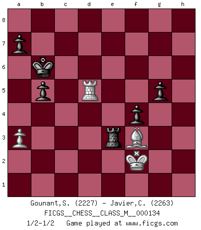 Last move : 1/2-1/2 2024 May 13 17:18:29 [Event "FICGS__CHESS__CLASS_M__000134"] [Site "FICGS"] [Date "2024.02.25"] [Round "1"] [White "Gounant,Stanislas"] [Black "Javier,Christian"] [Result "1/2-1/2"] [WhiteElo "2227"] [BlackElo "2263"] 1.c4 e5 2.d3 Nc6 3.Nf3 Nf6 4.g3 d5 5.cxd5 Nxd5 6.Nc3 Be7 7.Nxd5 Qxd5 8.Bg2 Be6 9.O-O Qd7 10.Be3 f6 11.Rc1 Nb4 12.a3 Nd5 13.Bc5 Bxc5 14.Rxc5 b6 15.Rc2 c5 16.Rd2 O-O-O 17.e4 Nc7 18.b4 Na6 19.bxc5 Nxc5 20.d4 Nb3 21.Rc2+ Kb8 22.d5 Bg4 23.h3 Bxf3 24.Bxf3 Nd4 25.Bg4 Qe8 26.Rd2 h5 27.Bf5 h4 28.Rxd4 exd4 29.gxh4 Qe7 30.Qf3 g6 31.Be6 f5 32.Qg3+ Kb7 33.e5 Qxh4 34.Qxh4 Rxh4 35.d6 b5 36.Rd1 Kb6 37.f3 Rxh3 38.Rxd4 Rxf3 39.Bf7 Kc5 40.Rd5+ Kc6 41.e6 Re3 42.e7 Rb8 43.Kf2 f4 44.Rd4 g5 45.Bh5 Re5 46.d7 Rxe7 47.d8Q Rxd8 48.Rxd8 Re3 49.Bf3+ Kb6 50.Rd5 1/2-1/2 Follow this game move after move (download)Only sissies Castle. (Rob Sillars) Über Kasparov: Es ist offensichtlich, daß er in einem totalitären Staat aufwuchs und deshalb zu diktatorischen Zügen neigt. (Viktor Kortschnoi) El Ajedrez es tan interesante por sí solo, que no es necesario un interés monetario para persuadir a una persona a que lo practique; por lo tanto, nunca se juega por dinero. (Benjamin Franklin) C'est une question de caractère, Beaucoup de gens perdent leur motivation très vite. D'autres, ils sont rares, peuvent la conserver très longtemps. J'aime les échecs, encore aujourd'hui je suis heureux d'analyser des parties. J'aime toujours gagner, je déteste encore perdre. Bien jouer est important pour mon intégrité intellectuelle et morale. Et puis les échecs vivent en ce moment une période historique grâce à Internet. Ils se développent dans les systèmes éducatifs à travers le monde. Ils sortent de leur ghetto, et c'est mon rôle de mener à bien cette révolution. (Gary Kasparov) When a man with money meets a man with experience, the man with experience leaves with money and the man with money leaves with experience. (Anonymous)