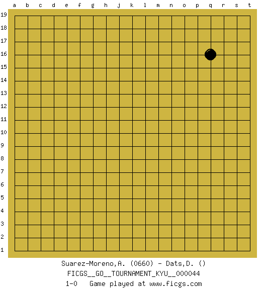 Last move : 1-0 2007 September 14 10:23:25 [Event "FICGS__GO__TOURNAMENT_KYU__000044"] [Site "FICGS"] [Date "2007.09.13"] [Round "1"] [Black "Suarez-Moreno,Alejandro"] [White "Dats,Dmitry"] [Result "1-0"] [Rating 1 "0660"] 1.q16 1-0 Here are the names of the openings (joseki) played in the four corners : Player Black won this Go (weiqi, baduk) game. Follow this game move after move (download)Learning josekis by heart is useless if you don't try departing from them. (Pierre Audouard) Don't be discouraged. It's often the last key in the bunch that opens the lock. (Author unknown)