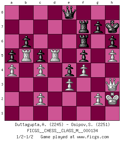 Last move : 1/2-1/2 2024 June 29 13:31:26 [Event "FICGS__CHESS__CLASS_M__000134"] [Site "FICGS"] [Date "2024.02.25"] [Round "1"] [White "Duttagupta,Aniruddha"] [Black "Osipov,Sergey"] [Result "1/2-1/2"] [WhiteElo "2245"] [BlackElo "2251"] 1.d4 Nf6 2.Nf3 e6 3.e3 d5 4.Bd3 b6 5.O-O Bb7 6.b3 Bd6 7.Bb2 O-O 8.Nbd2 Nbd7 9.Ne5 Ne4 10.f4 Ndf6 11.a4 a5 12.Nxe4 Nxe4 13.Bxe4 dxe4 14.Qg4 Ba6 15.Rfd1 Qc8 16.Nc4 f5 17.Qg3 Bxc4 18.bxc4 Rb8 19.d5 Rf7 20.h4 Bc5 21.h5 h6 22.Bd4 Bxd4 23.Rxd4 exd5 24.Rxd5 Qe6 25.Rad1 Rbf8 26.R1d4 Qc6 27.Rb5 Qe8 28.Qh3 c5 29.Rd6 Rf6 30.Rd5 Qc6 31.Kh2 R8f7 32.Qg3 Qe8 33.Qh3 Kh7 34.Re5 Qd8 35.Rd5 Qe8 1/2-1/2 Follow this game move after move (download)The Pin is mightier than the sword. (Fred Reinfeld) Schach ist das schnellste Spiel der Welt, weil man in jeder Sekunde Tausende von Gedanken ordnen muß. (Albert Einstein) Solo puedes ser bueno en el Ajedrez si amas al juego. (Bobby Fischer) Il n'y a pas de prix trop élevé au scalp de l'ennemi. (Koblentz) I'm extremely disappointed. I send you out for exciting, new designer drugs, you come back with tomato sauce. (Gregory House, House M.D.)