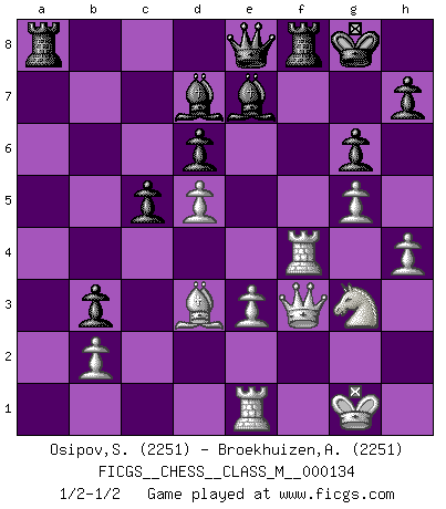 Last move : 1/2-1/2 2024 March 21 12:21:18 [Event "FICGS__CHESS__CLASS_M__000134"] [Site "FICGS"] [Date "2024.02.25"] [Round "1"] [White "Osipov,Sergey"] [Black "Broekhuizen,A. T. S."] [Result "1/2-1/2"] [WhiteElo "2251"] [BlackElo "2251"] 1.d4 Nf6 2.c4 e6 3.Nf3 b6 4.g3 Bb7 5.Bg2 Be7 6.O-O O-O 7.Nc3 Ne4 8.Bd2 Bf6 9.Rc1 c5 10.d5 exd5 11.cxd5 Nxd2 12.Nxd2 d6 13.Nde4 Be7 14.f4 a6 15.g4 b5 16.e3 Nd7 17.g5 Nb6 18.Ng3 b4 19.Na4 Nxa4 20.Qxa4 f6 21.h4 fxg5 22.fxg5 g6 23.Rce1 Bc8 24.Qd1 a5 25.Rf4 a4 26.Bf1 Qe8 27.Qf3 Bd7 28.Bd3 b3 29.axb3 axb3 1/2-1/2 Follow this game move after move (download)Via the squares on the chessboard, the Indians explain the movement of time and the age, the higher influences which control the world and the ties which link Chess with the human soul. (Al-Masudi) Es ist besser die Steine des Gegners zu opfern. (Savielly Grigorievitsch Tartakower) Aún el Rey más flojo huye despavorido ante la amenaza de un Jaque doble. (Aaron Nimzowitsch) Les Echecs représentent une sphère d'idées créatrices basée sur la volonté des deux protagonistes. (Smyslov) It is not true that people stop pursuing dreams because they grow old, they grow old because they stop pursuing dreams. (Gabriel Garcia Marquez)