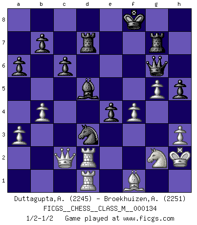 Last move : 1/2-1/2 2024 November 11 13:58:15 [Event "FICGS__CHESS__CLASS_M__000134"] [Site "FICGS"] [Date "2024.02.25"] [Round "1"] [White "Duttagupta,Aniruddha"] [Black "Broekhuizen,A. T. S."] [Result "1/2-1/2"] [WhiteElo "2245"] [BlackElo "2251"] 1.c4 Nf6 2.Nc3 d5 3.cxd5 Nxd5 4.g3 Nc6 5.Bg2 Nb6 6.Nf3 e5 7.O-O Be7 8.b3 O-O 9.Bb2 Bg4 10.Rc1 f5 11.d3 Rf7 12.Nb1 Bf6 13.b4 a6 14.a3 Qe7 15.h3 Bh5 16.Nbd2 e4 17.Bxf6 gxf6 18.dxe4 fxe4 19.Nh4 f5 20.Nb3 Rd8 21.Qc2 Qf6 22.e3 Ne5 23.Nd4 Bg6 24.Qb3 Nd5 25.Rcd1 R8d7 26.Ne2 c6 27.f3 Bh5 28.Nf4 Nxf4 29.exf4 Nd3 30.Kh2 Kf8 31.Rd2 Rfe7 32.Qc2 Bf7 33.Rfd1 Bd5 34.fxe4 fxe4 35.Bf1 Rg7 36.Ng2 Qg6 37.g4 h5 38.g5 1/2-1/2 Follow this game move after move (download)The battle for the ultimate truth will never be won. And that's why Chess is so fascinating. (Hans Kmoch) Bobby Fischer ist kein Vorbild für die heutige Jugend. (Viktor Kortschnoi) El Ajedrez demanda una total concentración. (Bobby Fischer) Si rien de grave n'est détecté lors de l'analyse d'une position, on joue alors le coup. Seconde règle de Blumenfeld. Some people are so afraid to die that they never begin to live. (Henry Van Dyke)