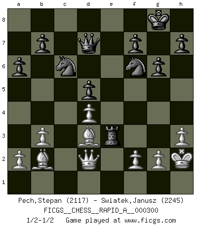 Last move : 1/2-1/2 2024 June 17 3:32:39 [Event "FICGS__CHESS__RAPID_A__000300"] [Site "FICGS"] [Date "2024.02.25"] [Round "1"] [White "Pech,Stepan"] [Black "Swiatek,Janusz"] [Result "1/2-1/2"] [WhiteElo "2117"] [BlackElo "2245"] 1.d4 d5 2.c4 e6 3.Nc3 Nf6 4.Nf3 c5 5.e3 Nc6 6.cxd5 exd5 7.Bb5 cxd4 8.Nxd4 Bd7 9.O-O Bd6 10.Nf3 Be6 11.b3 a6 12.Bd3 Bg4 13.Bb2 Qe7 14.h3 Bxf3 15.Qxf3 Rd8 16.Rae1 O-O 17.Ne2 Be5 18.Nd4 Bxd4 19.exd4 Qd6 20.Qd1 g6 21.Re3 Rfe8 22.Rfe1 Rxe3 23.Rxe3 Re8 24.Qd2 Qd7 25.Kh2 Rxe3 1/2-1/2 Follow this game move after move (download)There are two types of sacrifices: correct ones and mine. (Mikhail Tal) Gewöhnliche Menschen denken nur daran, wie sie ihre Zeit verbringen. Ein intelligenter Mensch versucht, sie auszunutzen. (Arthur Schopenhauer) Por tratar de evitar la pérdida de una pieza, muchas personas han perdido una partida de Ajedrez. (Savielly Tartakover) La vérité est comme le meilleur coup aux échecs : elle existe, mais il faut la chercher. (Arturo Perez-Reverte) If you lose the game you should win the analysis! (Proverb)