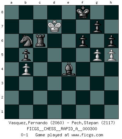 Last move : 0-1 2024 August 27 3:2:0 [Event "FICGS__CHESS__RAPID_A__000300"] [Site "FICGS"] [Date "2024.02.25"] [Round "1"] [White "Vasquez,Fernando"] [Black "Pech,Stepan"] [Result "0-1"] [WhiteElo "2060"] [BlackElo "2117"] 1.e4 d5 2.exd5 Qxd5 3.Nc3 Qa5 4.d4 Nf6 5.Nf3 c6 6.Bc4 Bf5 7.O-O e6 8.Re1 Nbd7 9.Bf4 Bb4 10.Bd2 Qc7 11.a3 Bd6 12.h3 h6 13.Qe2 O-O 14.Bb3 Rad8 15.Rad1 b5 16.Ne5 a5 17.Bf4 Nxe5 18.Bxe5 Bxe5 19.f4 Bxd4+ 20.Rxd4 Rxd4 21.Qe5 Qb6 22.Qe3 c5 23.Ne2 Rd6 24.Ng3 Bg6 25.Ba2 Bxc2 26.Rc1 Bg6 27.Kh2 Rd3 28.Qe1 c4 29.a4 Qd4 30.Bb1 Qxf4 31.Bxd3 cxd3 32.Rd1 Qxa4 33.Nf1 Qc2 34.Rd2 Qc7+ 35.Kg1 a4 36.b3 a3 37.Ra2 Ra8 38.h4 Ne4 39.h5 Bh7 40.Qe3 Nc3 41.Ra1 Ne2+ 42.Kf2 Qc3 43.Ra2 Nc1 44.Qf3 Rc8 45.Rd2 a2 46.Rxa2 Qc5+ 47.Qe3 Qxe3+ 48.Kxe3 Nxa2 49.g4 Nb4 50.Kf4 Rc2 51.Ke3 Nd5+ 52.Kd4 d2 53.Nxd2 Rxd2+ 54.Kc5 Rc2+ 55.Kd6 f6 56.Kxe6 Be4 57.b4 Kf8 58.g5 Rc6+ 59.Kd7 Nb6+ 0-1 Follow this game move after move (download)Bobby is the finest Chess player this country ever produced. His memory for the moves, his brilliance in dreaming up combinations, and his fierce determination to win are uncanny. (John Collins) Nur ein wirklich starker Spieler weiß wie schwach er spielt. (Savielly Grigorievitsch Tartakower) No puedes jugar al Ajedrez si eres de corazón noble. (Proverbio Francés) Soyez une menace à chaque fois que vous vous asseyez pour jouer. (Ken Smith) Life is like a game of cards: the hand you are dealt represents determinism; the way you play it is free will. (Jawaharlal Nehru)