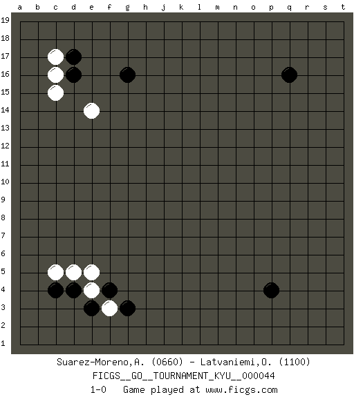 Last move : 1-0 2007 November 8 6:54:16 [Event "FICGS__GO__TOURNAMENT_KYU__000044"] [Site "FICGS"] [Date "2007.09.13"] [Round "1"] [Black "Suarez-Moreno,Alejandro"] [White "Latvaniemi,Oskar"] [Result "1-0"] [Rating 1 "0660"] [Rating 2 "1100"] 1.q16 e4 2.p4 c15 3.d16 c16 4.d17 c17 5.g16 e14 6.c4 c5 7.d4 d5 8.e3 f3 9.f4 e5 10.g3 1-0 This go game has been lost on time (started : 2007.09.13 13:31:26) Here are the names of the openings (joseki) played in the four corners : Corner d16 : c15 d16 Mokuhazushi (Waemok, Wai`mu`) 5-3 Point. The mokuhazushi (5-3) point was popular in the Edo period in Japan (1600 - 1867). It emphasizes influence; territorially, it is inferior to the 3-4 point. Corner d4 : e4 c4 Takamoku (Gomok, Gaomu`) 5-4 Point. The takamoku (high) point (5-4). With its emphasis on influence, the 5-4 point complements the 4-4 (hoshi) point in creating an influence-oriented fuseki. Komoku. White responds with 3-3, 3-5, 4-6, 4-7, 3-6, 3-7. Player Black won this Go (weiqi, baduk) game. Follow this game move after move (download)Five liberties for tactical stability. (Anonymous) The Internet is the world's largest library. It's just that all the books are on the floor. (John Allen Paulos)