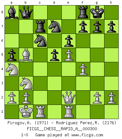 Last move : 1-0 2024 May 9 21:17:22 [Event "FICGS__CHESS__RAPID_A__000300"] [Site "FICGS"] [Date "2024.02.25"] [Round "1"] [White "Pirogov,Andrey Mikhaylovich"] [Black "Rodriguez Perez,Rene"] [Result "1-0"] [WhiteElo "1971"] [BlackElo "2176"] 1.e4 e6 2.d4 d5 3.Nc3 Nf6 4.e5 Nfd7 5.f4 c5 6.Nf3 Nc6 7.Be3 cxd4 8.Nxd4 Bc5 9.Qd2 O-O 10.O-O-O a6 11.Nb3 Bxe3 12.Qxe3 b5 13.Kb1 b4 14.Na4 a5 15.c4 bxc3 16.Qxc3 Bb7 17.Bb5 Rc8 18.Qe3 Rc7 19.Rhe1 Qb8 20.Rc1 Ba8 21.Qe2 1-0 This chess game has been lost on time (started : 2024.02.25 13:37:41) Follow this game move after move (download)Blessed be the memory of him who gave the world this immortal game. (A. G. Gardiner) Ich bewundere Kasparows phantasievolle Angriffssiege aus den Achtzigern und Neunzigern, aber wenn man sie mit dem Computer überprüft, nimmt der Computer in jeder zweiten Partie die Opfer an, verteidigt sich und gewinnt. (Vladimir Kramnik) El Rey es una pieza de pelea. ¡Usenlo!. (Wilhelm Steinitz) Les Echecs sont affaire de jugement sensible. Savoir quand frapper et quand esquiver. (Fischer) Somehow our devils are never quite what we expect when we meet them face to face. (Nelson DeMille)