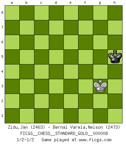 Last move : 1/2-1/2 2024 October 16 23:4:8 [Event "FICGS__CHESS__STANDARD_GOLD__000008"] [Site "FICGS"] [Date "2024.02.25"] [Round "2"] [White "Zidu,Jan"] [Black "Bernal Varela,Nelson"] [Result "1/2-1/2"] [WhiteElo "2463"] [BlackElo "2473"] 1.e4 c5 2.Nf3 e6 3.d4 cxd4 4.Nxd4 Nc6 5.Nc3 a6 6.Bf4 d6 7.Bg3 Be7 8.Be2 Bd7 9.Qd3 b5 10.a3 Ne5 11.Qe3 h5 12.Rd1 h4 13.Bxe5 dxe5 14.Nc6 Qc7 15.Nxe7 Nxe7 16.O-O Ng6 17.Rd2 O-O 18.Rfd1 Bc6 19.Na2 a5 20.Nc1 Nf4 21.Nd3 Nxd3 22.Bxd3 Qe7 23.c3 b4 24.axb4 axb4 25.Bf1 bxc3 26.Qxc3 Bxe4 27.Qxe5 Bf5 28.h3 Rfb8 29.Bd3 Bxd3 30.Rxd3 Rb7 31.Rd4 Rab8 32.Rg4 f5 33.Rg6 Rb5 34.Qxe6+ Qxe6 35.Rxe6 Rxb2 36.Rd5 R2b5 37.Rxb5 Rxb5 38.Kf1 Kf7 39.Re3 Rb1+ 40.Ke2 Rg1 41.g3 hxg3 42.Rxg3 Rxg3 43.fxg3 g5 44.Kf3 Kg7 45.g4 f4 46.h4 gxh4 47.Kxf4 Kg6 48.g5 h3 49.Kg3 Kxg5 50.Kxh3 Kh5 51.Kg3 1/2-1/2 Follow this game move after move (download)Good positions don't win games, good moves do. (Gerald Abrahams) Schach ist mein Leben, meine Leidenschaft, was ich gelernt habe und seit meinem 14. Lebensjahr profimässig praktiziere. Darauf zu verzichten, würde mir sehr schwer fallen. (Viktor Kortschnoi) Cuando le juegas a Fischer, no es una cuestion de si vas a ganar o perder. Es una cuestion de si vas a sobrevivir. (Boris Spassky) Je crois qu'il existe des manières très spécifiques de jouer efficacement contre une machine. Evidemment, nous n'avons aucune chance en technique pure, parce que l'ordinateur calcule de manière parfaite. Mais lorsque nous faisons appel à notre cerveau, en utilisant l'intuition et la compréhension, alors nous restons beaucoup plus forts. (Anatoli Karpov) Do not put your faith in what statistics say until you have carefully considered what they do not say. (William W. Watt)