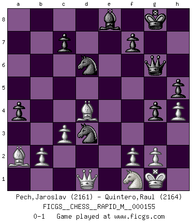 Last move : 0-1 2024 July 2 3:30:42 [Event "FICGS__CHESS__RAPID_M__000155"] [Site "FICGS"] [Date "2024.02.26"] [Round "1"] [White "Pech,Jaroslav"] [Black "Quintero,Raul"] [Result "0-1"] [WhiteElo "2161"] [BlackElo "2164"] 1.e4 e5 2.Nf3 Nc6 3.Bb5 a6 4.Ba4 Nf6 5.O-O b5 6.Bb3 Bc5 7.a4 Bb7 8.d3 O-O 9.Bg5 h6 10.Bh4 g5 11.Bg3 d6 12.c3 Ne7 13.Nbd2 Ng6 14.Re1 Bb6 15.h4 g4 16.Nh2 h5 17.Ndf1 bxa4 18.Rxa4 Bc6 19.Ra1 a5 20.Ne3 Bxe3 21.Rxe3 d5 22.Bxe5 dxe4 23.Bd4 a4 24.Ba2 Re8 25.dxe4 Rb8 26.Qc1 Qd6 27.e5 Nxe5 28.Nf1 Ne4 29.Qc2 Qg6 30.Rae1 Nd6 31.Qd1 Nd3 32.Rxe8+ Rxe8 33.Rxe8+ Bxe8 0-1 This chess game has been lost on time (started : 2024.02.26 14:39:39) Follow this game move after move (download)Fischer is under obligation to nobody. (Joseph Platz) Woher wissen wir, daß der Neanderthaler Blindschach gespielt hat? -- Bei Ausgrabungen wurden keine Schachbretter und Figuren gefunden. (Anonymous) Durante una competencia de Ajedrez, un Maestro de Ajedrez deberá ser una combinación de presa de caza y un Monge. (Alexander Alekhine) Si je n'étais pas joueur d'échecs, je serais le meilleur dans quelque chose d'autre. (Anatoli Karpov) God, you are such an idiot. - Actually, I thought I was more of a jerk. (Gregory House to Stacy Warner, House M.D.)