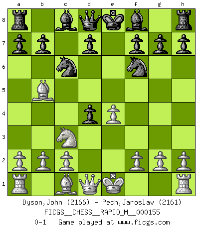 Last move : 0-1 2024 April 19 17:59:56 [Event "FICGS__CHESS__RAPID_M__000155"] [Site "FICGS"] [Date "2024.02.26"] [Round "1"] [White "Dyson,John"] [Black "Pech,Jaroslav"] [Result "0-1"] [WhiteElo "2166"] [BlackElo "2161"] 1.e4 c5 2.Nc3 Nc6 3.Nge2 Nf6 4.d4 cxd4 5.Nxd4 e5 6.Bb5 exd4 0-1 Follow this game move after move (download)A thorough understanding of the typical mating continuations makes the most complicated sacrificial combinations leading up to them not only not difficult, but almost a matter of course. (Siegbert Tarrasch) Es hat in meinem Leben Zeiten gegeben, in denen das Schachspiel, wenn nicht zum Lebenszweck, so doch zu einem regelrechten Lebensersatz geworden ist. Man fühlt sich in solchen Zeiten nicht so, als besäße man eine göttliche Gabe, sondern eher so, als sei man von ihr besessen. (Garry Kasparov) EL Ajedrez es como la vida. (Boris Spassky) La tactique est l'élément le plus important du milieu de jeu. (Siegbert Tarrasch) What doesn't kill us makes us stronger. (Friedrich Nietzsche)