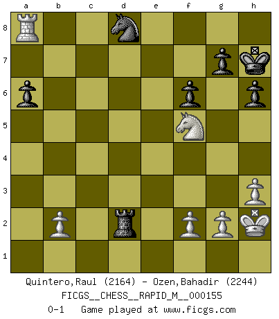 Last move : 0-1 2024 May 18 2:20:42 [Event "FICGS__CHESS__RAPID_M__000155"] [Site "FICGS"] [Date "2024.02.26"] [Round "1"] [White "Quintero,Raul"] [Black "Ozen,Bahadir"] [Result "0-1"] [WhiteElo "2164"] [BlackElo "2244"] 1.e4 e5 2.Nf3 Nc6 3.Bb5 a6 4.Ba4 Nf6 5.d3 b5 6.Bb3 Be7 7.O-O O-O 8.h3 d6 9.Bd2 h6 10.a3 Be6 11.Nc3 d5 12.exd5 Nxd5 13.Re1 Nxc3 14.Bxc3 Bxb3 15.cxb3 f6 16.d4 b4 17.axb4 exd4 18.Bxd4 Bxb4 19.Bc3 Qxd1 20.Rexd1 Rfb8 21.Bxb4 Rxb4 22.Rac1 Rd8 23.Rxd8+ Nxd8 24.Rxc7 Rxb3 25.Rc8 Rd3 26.Ra8 Rd1+ 27.Kh2 Rd6 28.Nh4 Kh7 29.Nf5 Rd2 0-1 This chess game has been lost on time (started : 2024.02.26 14:39:39) Follow this game move after move (download)It is the aim of the modern school, not to treat every position according to one general law, but according to the principle inherent in the position. (Richard Reti) Ich glaube nicht an Psychologie, ich glaube an gute Züge. (Robert James Fischer) Los asuntos humanos son como una partida de Ajedrez: solo aquellos que no lo toman seriamente, pueden ser llamados buenos jugadores. (Hung Tzu Ch'eng) Des idées, des idées, j'en ai cent, j'en ai mille. Des bonnes, des mauvaises, applicables, irréalisables... Il suffit de faire le tri ! (Roos) All war is based on deception. (Sun Tzu)