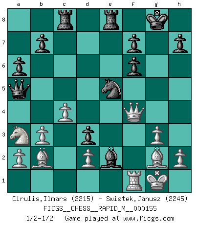 Last move : 1/2-1/2 2024 April 3 11:25:21 [Event "FICGS__CHESS__RAPID_M__000155"] [Site "FICGS"] [Date "2024.02.26"] [Round "1"] [White "Cirulis,Ilmars"] [Black "Swiatek,Janusz"] [Result "1/2-1/2"] [WhiteElo "2215"] [BlackElo "2245"] 1.f4 Nf6 2.c4 e6 3.Nf3 d5 4.e3 c5 5.b3 Bd6 6.g3 Nc6 7.Bb2 O-O 8.Bg2 d4 9.O-O e5 10.fxe5 Bxe5 11.Nxe5 Nxe5 12.exd4 cxd4 13.Qc2 Bg4 14.Rf4 Re8 15.Na3 d3 16.Qc3 a6 17.Raf1 Rc8 18.Qd4 Qa5 19.Rxf6 gxf6 20.Qf4 Be2 1/2-1/2 Follow this game move after move (download)Daring ideas are like Chess men moved forward. They may be beaten, but they may start a winning game. (Johann Wolfgang von Goethe) Moralische Siege zählen nicht. (Savielly Grigorievitsch Tartakower) El Ajedrez no es una pizca de inferior al violín, y tenemos un gran número de violinistas profesionales. (Mikhail Botvinnik) Le génie consiste à savoir transgresser les règles au moment opportun. (Teichmann) The next best thing to gambling and winning is gambling and loosing. (Nick Dandalos)