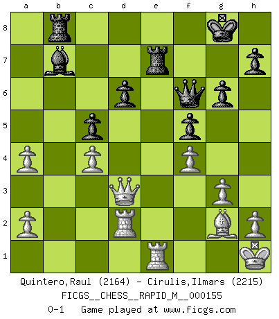 Last move : 0-1 2024 May 1 19:50:54 [Event "FICGS__CHESS__RAPID_M__000155"] [Site "FICGS"] [Date "2024.02.26"] [Round "1"] [White "Quintero,Raul"] [Black "Cirulis,Ilmars"] [Result "0-1"] [WhiteElo "2164"] [BlackElo "2215"] 1.Nf3 f5 2.b3 d6 3.d4 g6 4.Bb2 Bg7 5.c4 Nf6 6.g3 O-O 7.Bg2 Ne4 8.O-O Nc6 9.Nbd2 Nxd2 10.Qxd2 e5 11.Ng5 Bf6 12.d5 Bxg5 13.f4 exf4 14.dxc6 f3 15.Qd5+ Rf7 16.exf3 bxc6 17.Qxc6 Be3+ 18.Kh1 Rb8 19.Qd5 Bb7 20.Qd3 Bg5 21.Rae1 Bf6 22.Bxf6 Qxf6 23.f4 c5 24.Rf2 a5 25.Rd2 a4 26.bxa4 Re7 0-1 This chess game has been lost on time (started : 2024.02.26 14:39:39) Follow this game move after move (download)The battle for the ultimate truth will never be won. And that's why Chess is so fascinating. (Hans Kmoch) Bobby Fischer ist kein Vorbild für die heutige Jugend. (Viktor Kortschnoi) Ciertamente el estado mental actual de Bobby Fischer es una tragedia. Uno de los mas grandes jugadores de Ajedrez del mundo -el orgullo y pena del Ajedrez Americano. (Frank Brady) Si rien de grave n'est détecté lors de l'analyse d'une position, on joue alors le coup. Seconde règle de Blumenfeld. I've never seen so many men wasted so badly. (Blondie in The Good, The Bad and The Ugly)