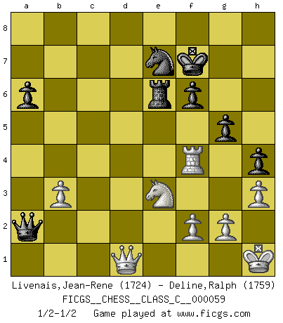 Last move : 1/2-1/2 2008 February 1 19:38:17 [Event "FICGS__CHESS__CLASS_C__000059"] [Site "FICGS"] [Date "2007.09.14"] [Round "1"] [White "Livenais,Jean-Rene"] [Black "Deline,Ralph"] [Result "1/2-1/2"] [WhiteElo "1724"] [BlackElo "1759"] 1.e4 e5 2.Nf3 Nc6 3.Bb5 a6 4.Ba4 Nf6 5.O-O b5 6.Bb3 Be7 7.Re1 d6 8.c3 O-O 9.h3 Bb7 10.d4 Re8 11.Nbd2 exd4 12.cxd4 Nd7 13.Nf1 Na5 14.Bc2 c5 15.Ne3 cxd4 16.Nxd4 Bf6 17.Ndf5 Bxe4 18.Nxd6 Bxc2 19.Qxc2 Re6 20.Rd1 Qf8 21.Ndf5 Nb6 22.Ng4 Rc8 23.Qd3 Nc6 24.Nxf6+ Rxf6 25.Bg5 Rg6 26.Bf4 Nc4 27.Qc2 Nb4 28.Qb1 Nc6 29.b3 N4e5 30.Rd5 Re8 31.Be3 Rd8 32.Qe4 Rxd5 33.Qxd5 Re6 34.Rd1 Qe8 35.Qc5 h6 36.Bf4 Ng6 37.Bd6 Re2 38.Qc3 f6 39.Qa1 Re6 40.Ne3 Nce5 41.Qd4 Nf7 42.Ba3 Nfe5 43.Kf1 Qc8 44.Qe4 Kf7 45.Nd5 Nc6 46.Qg4 Nce5 47.Qf5 Nc6 48.Qc2 Qb8 49.Kg1 Nf4 50.Ne3 Kg8 51.Qd2 b4 52.Bb2 Ne7 53.Qd7 Kf7 54.Rd2 h5 55.Kh1 h4 56.Rd4 Qe5 57.Rxb4 Qxb2 58.Rxf4 Qxa2 59.Qd1 g5 1/2-1/2 Ruy Lopez : 5.O-O Kingside Castling by player White (move 5) Kingside Castling by player Black (move 8) This chess game ended in a draw. Follow this game move after move (download)I give 98 percent of my mental energy to Chess. Others give only 2 percent. (Bobby Fischer) Sie führen leise Selbstgespräche, schlürfen lautstark ihre Getränke, schmatzen hörbar beim Essen, blasen ihrem Gegenüber Rauch in die Augen, niesen ihm ins Gesicht, starren ihn unverwandt an, bis er sich unter ihren Blicken windet, rutschen ständig auf ihrem Stuhl hin und her, rülpsen und bohren in der Nase. (Anonymous) Un juego de Ajedrez es un dialogo, una conversación entre un jugador y su oponente. Cada movimiento del oponente puede contener amenazas o tropiezos, pero un jugador no se puede defender de las amenazas o tomar ventaja de los tropiezos si es que no se pregunta a sí mismo: ¿Que es lo que mi oponente va a hacer después de cada movida?. (Bruce A. Moon) Les Echecs mettent en conflit, non pas deux intelligences, mais deux volontés. (Lasker) Memory... is the diary that we all carry with us. (Oscar Wilde, The Importance of Being Earnest)
