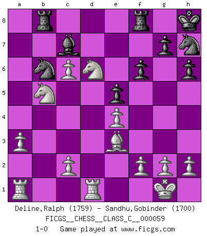 Last move : 1-0 2008 February 14 1:23:52 [Event "FICGS__CHESS__CLASS_C__000059"] [Site "FICGS"] [Date "2007.09.14"] [Round "1"] [White "Deline,Ralph"] [Black "Sandhu,Gobinder"] [Result "1-0"] [WhiteElo "1759"] [BlackElo "1700"] 1.e4 e5 2.Nf3 Nc6 3.Bb5 d6 4.d4 Bd7 5.d5 Nb8 6.Bxd7+ Qxd7 7.Nc3 Be7 8.O-O Nf6 9.Qd3 O-O 10.a3 h6 11.Rd1 Nh7 12.Be3 Qd8 13.b4 f6 14.Nh4 Qe8 15.Nb5 Bd8 16.Bxa7 Nd7 17.Nf5 Kh8 18.Be3 Qf7 19.Nc3 Rb8 20.Qb5 c6 21.dxc6 bxc6 22.Qxc6 Nb6 23.Nxd6 Qc7 24.b5 Qxc6 25.bxc6 Bc7 26.Ncb5 1-0 Ruy Lopez : Old Steinitz defense Kingside Castling by player White (move 8) Kingside Castling by player Black (move 9) Player White won this chess game. Follow this game move after move (download)There must have been a time when men were demigods, or they could not have invented Chess. (Gustav Schenk) Der beste Spieler in einem Turnier gewinnt es nie. Er landet auf Platz zwei oder drei. (Siegbert Tarrasch) La mitad de las variaciones que son calculadas en una partida de torneo, resultan ser completamente superfluas. Desafortunadamente, nadie sabe por adelantado cual mitad. (Jan Tinman) Echiquier : carré parfait, comme la Jérusalem nouvelle décrite par l'auteur de l'Apocalypse, huit cases sur huit, exaltation du chiffre 4, symbole du cosmos aux quatre horizons... où le noir et le blanc, l'ombre et la lumière, le mal et le bien s'entremêlent et se conjuguent. (Robert Couffignal, Le Gambit du poète) Panic is a sudden desertion of us, an a going over to the enemy of our imagination. (Christian Nevell Bovee)