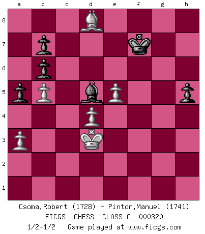 Last move : 1/2-1/2 2024 May 3 17:39:0 [Event "FICGS__CHESS__CLASS_C__000320"] [Site "FICGS"] [Date "2024.03.05"] [Round "1"] [White "Csoma,Robert"] [Black "Pintor,Manuel"] [Result "1/2-1/2"] [WhiteElo "1728"] [BlackElo "1741"] 1.e4 e5 2.Nf3 Nc6 3.d4 exd4 4.Nxd4 Qf6 5.Be3 Bc5 6.c3 Nxd4 7.cxd4 Bb4+ 8.Nd2 d6 9.a3 Ba5 10.b4 Bb6 11.Nc4 Qg6 12.Qc2 d5 13.Nxb6 cxb6 14.f3 dxe4 15.fxe4 Nf6 16.Bd3 Ng4 17.Bg1 Qh6 18.Qd2 Qxd2+ 19.Kxd2 O-O 20.h3 Nf6 21.e5 Nd5 22.Be4 Be6 23.Bf2 Rac8 24.Rac1 f5 25.Bf3 a5 26.b5 g5 27.Be2 Nf4 28.g3 Nd5 29.Rxc8 Rxc8 30.Rc1 Rxc1 31.Kxc1 Nc3 32.Bd3 h5 33.Kc2 Nd5 34.Kd2 Kf7 35.Kc2 f4 36.gxf4 Nxf4 37.h4 Nxd3 38.Kxd3 gxh4 39.Bxh4 Bd5 40.Bd8 1/2-1/2 Follow this game move after move (download)The beauty of a move lies not in its' appearance but in the thought behind it. (Siegbert Tarrasch) Rauchen ist dem Schachspieler bei seiner Arbeit, also im Wettkampf, untersagt. (Viktor Kortschnoi) La última cosa en que Fischer estaba interesado era en tonterías, siempre y cuando el Ajedrez estuviera involucrado. (Elie Agur) Seul un grand joueur sait à quel point il joue faiblement. (Xavier Tartacover) To be champion requires more than simply being a strong player; one has to be a strong human being as well. (Anatoly Karpov)