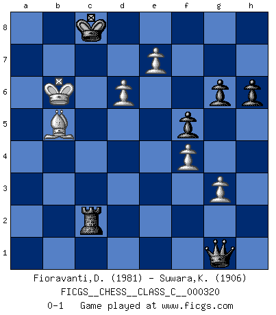 Last move : 0-1 2025 May 24 9:29:39 [Event "FICGS__CHESS__CLASS_C__000320"] [Site "FICGS"] [Date "2024.03.05"] [Round "1"] [White "Fioravanti,Diego"] [Black "Suwara,Kazimierz"] [Result "0-1"] [WhiteElo "1981"] [BlackElo "1906"] 1.Nf3 d5 2.g3 c5 3.c4 d4 4.b4 a5 5.bxc5 Nc6 6.Bg2 e5 7.d3 e4 8.dxe4 Bxc5 9.O-O Be6 10.Nbd2 Nge7 11.Ne1 Qd7 12.Nd3 Bb4 13.Qa4 O-O 14.a3 Bc3 15.Rb1 Qc8 16.Rd1 Rd8 17.c5 Qc7 18.Nc4 Bxc4 19.Qxc4 Ng6 20.f4 a4 21.Qb5 Rdb8 22.Bd2 Nge7 23.Bxc3 dxc3 24.Nb4 Nxb4 25.Rxb4 Ra5 26.Qb6 Rxc5 27.Qxc7 Rxc7 28.Rc1 b5 29.Kf2 f6 30.e3 Kf7 31.Bf1 Rc5 32.Rd4 Rbc8 33.Rd7 Rb8 34.Rd3 Rbc8 35.Rc2 g6 36.Ke1 Rc4 37.Rd4 Rxd4 38.exd4 f5 39.e5 b4 40.axb4 Nd5 41.Bb5 a3 42.Ba4 Nxb4 43.Bb3+ Ke7 44.Kd1 Nxc2 45.Kxc2 h6 46.d5 Ra8 47.Ba2 Rb8 48.d6+ Kd7 49.Kxc3 Rb2 50.Bc4 Rxh2 51.Bb5+ Kc8 52.e6 a2 53.e7 a1Q+ 54.Kc4 Qf1+ 55.Kc5 Rc2+ 56.Kb6 Qg1+ 0-1 Follow this game move after move (download)Chess is thirty to forty percent psychology. You don't have this when you play a computer. I can't confuse it. (Judith Polgar) Wer mein Gambit spielt, muß bereit sein, alle Brücken hinter sich abzubrechen. Es verändert den ganzen Menschen. Es wirkt wie ein Zauberstab und fördert verkümmerte, gute Charakter- eigenschaften wieder zu Tage. (Emil Joseph Diemer) No solamente yo pronostico su triunfo sobre Botvinnik, sino que me adelanto y digo que probablemente Fischer es el jugador de Ajedrez mas grande que haya existido. (John Collins) Pour moi, les échecs ne sont pas un jeu mais un art. (Alexandre Alekhine) Yoga is 99% practice and 1% knowledge. (Sri Krishna Pattabhi Jois)
