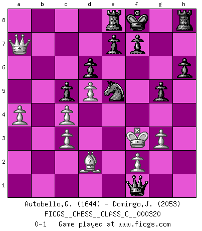 Last move : 0-1 2024 July 14 13:59:23 [Event "FICGS__CHESS__CLASS_C__000320"] [Site "FICGS"] [Date "2024.03.05"] [Round "1"] [White "Autobello,Giovanni"] [Black "Domingo,Jordi"] [Result "0-1"] [WhiteElo "1644"] [BlackElo "2053"] 1.c4 g5 2.Nc3 Bg7 3.d4 h6 4.e4 c5 5.Nge2 d6 6.g3 Bg4 7.Be3 Nc6 8.Qa4 Bd7 9.Qd1 Bg4 10.d5 Bxc3+ 11.bxc3 Bf3 12.Rg1 Ne5 13.h3 Bxe4 14.Bg2 Bxg2 15.Rxg2 Qd7 16.Qb3 Nf3+ 17.Kf1 Qxh3 18.Qxb7 Rd8 19.Qc6+ Kf8 20.Qc7 Re8 21.Qxa7 Nf6 22.a4 Ng4 23.Ng1 Ngh2+ 24.Ke2 Qxg2 25.Nxf3 Qxf3+ 26.Ke1 Qh1+ 27.Ke2 Qxa1 28.Bd2 Qf1+ 29.Ke3 Ng4+ 30.Kf3 Ne5+ 0-1 Follow this game move after move (download)The way he plays Chess demonstrates a man's whole nature. (Stanley Ellin) Offener Brief an US-Präsident Bush anlässlich der Verhaftung Bobby Fishers: Verhaften Sie mich. Stecken Sie mich in dieselbe Zelle wie Bobby Fisher und geben Sie uns ein Schachspiel mit. (Boris Vassilievich Spassky) Estaba muy claro de que el punto vulnerable del Gran Maestro Americano (Bobby Fischer) radicaba en las posiciones de doble filo, colgantes, irracionales, donde el siempre falló en encontrar un triunfo aún en una posición de clara victoria. (Efim Geller) Votre prénom est 'Tactique', votre deuxième prénom est 'Tactique' et votre nom est 'Tactique'. (Ken Smith) You can think I'm wrong, but that's no reason to quit thinking. (Gregory House, House M.D.)