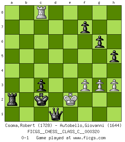 Last move : 0-1 2024 December 16 20:49:26 [Event "FICGS__CHESS__CLASS_C__000320"] [Site "FICGS"] [Date "2024.03.05"] [Round "1"] [White "Csoma,Robert"] [Black "Autobello,Giovanni"] [Result "0-1"] [WhiteElo "1728"] [BlackElo "1644"] 1.e4 c5 2.Nf3 d6 3.d4 cxd4 4.Nxd4 Nf6 5.Nc3 a6 6.Bd3 Nc6 7.Nxc6 bxc6 8.O-O g6 9.h3 Bg7 10.Be3 O-O 11.Qd2 Qc7 12.Bh6 Bb7 13.Bxg7 Kxg7 14.Bc4 c5 15.Rfe1 Rab8 16.Nd5 Nxd5 17.exd5 Kg8 18.Qe2 Rfe8 19.b3 a5 20.Bb5 Rf8 21.Qxe7 Qxe7 22.Rxe7 Bxd5 23.Bd3 Be6 24.Ra7 Ra8 25.Rxa8 Rxa8 26.Rd1 d5 27.Kh2 a4 28.Bb5 axb3 29.axb3 Ra2 30.Rd2 d4 31.Ba4 Bf5 32.Kg3 Bxc2 33.Re2 Bxb3 34.Re8+ Kg7 35.Bxb3 Ra3 36.Rb8 c4 37.Kf4 Rxb3 38.Rc8 Rb4 39.Ke4 d3 40.Ke3 Kf6 41.g3 h5 42.f3 Ke6 43.Rc6+ Kd7 44.Rc5 Kd6 45.Rc8 Ra4 46.Kd2 Ra2+ 47.Kd1 Kd5 48.Rd8+ Kc5 49.Rc8+ Kd4 50.Rd8+ Kc3 51.Ke1 d2+ 52.Ke2 Kb3 53.Rb8+ Kc2 54.Rd8 c3 55.Rc8 d1Q+ 0-1 Follow this game move after move (download)Only sissies Castle. (Rob Sillars) Im Fernschach kannst du während dem Spiel rauchen. (John Christen Knudsen) Aquel que teme a un Peón de Reina aislado, debería de retirarse del Ajedrez. (Siegbert Tarrasch) Mais l'homme est une créature légère et illogique : semblable au joueur d'échecs, il n'aime que le processus du but à atteindre, non le but lui-même. (Dostoïevsky) A specialist learns more and more about less and less until he knows everything about nothing. (Nicholas Murray Butler)