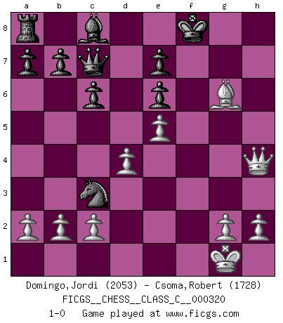 Last move : 1-0 2024 March 31 22:46:53 [Event "FICGS__CHESS__CLASS_C__000320"] [Site "FICGS"] [Date "2024.03.05"] [Round "1"] [White "Domingo,Jordi"] [Black "Csoma,Robert"] [Result "1-0"] [WhiteElo "2053"] [BlackElo "1728"] 1.e4 d6 2.d4 Nf6 3.Nc3 g6 4.f4 Bg7 5.Nf3 O-O 6.Bd3 c6 7.O-O Qc7 8.Qe1 Nbd7 9.e5 dxe5 10.fxe5 Nd5 11.Qh4 Nxc3 12.Ng5 h6 13.Ne6 fxe6 14.Bxh6 Rxf1+ 15.Rxf1 Nf8 16.Bxg7 Kxg7 17.Rxf8 Kxf8 18.Bxg6 1-0 Follow this game move after move (download)What is the difference between chess and football? Everybody understands football, but nobody plays it. Everybody plays chess, but nobody understands it. Everything is relative. (Vladimir Kramnik) Weshalb minderdergeübte Spieler mit g2-g4 beginnen? Die betreffenden sind unschlüssig, ob sie nun rechts (h4) oder links (f4) beginnen sollen, und in ihrer Ratlosigkeit entschliessen sie sich nach guter Bürgerart dazu, den goldenen Mittelweg zu wählen. (Aaron Nimzowitsch) ¿Cual es el objetivo de jugar una apertura de gambito?... Para adquirir una reputación de ser un jugador apuesto a costo de perder el juego. (Siegbert Tarrasch) L'action d'une oeuvre littéraire se déroule sur un champ de bataille. Les masques et les types du drame moderne correspondent aux pièces du jeu d'échecs. L'intrigue correspond aux coups et aux gambits, c'est à dire aux techniques du jeu telles qu'utilisées et interprétées par les joueurs. Les tactiques et les péripéties [mouvements] correspondent aux coups exécutés par l'adversaire. (Viktor Shklovsky) An expert is a man who has made all the mistakes which can be made in a very narrow field. (Niels Bohr)