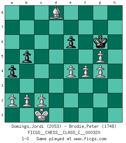 Last move : 1-0 2024 May 16 11:3:21 [Event "FICGS__CHESS__CLASS_C__000320"] [Site "FICGS"] [Date "2024.03.05"] [Round "1"] [White "Domingo,Jordi"] [Black "Brodie,Peter"] [Result "1-0"] [WhiteElo "2053"] [BlackElo "1748"] 1.e4 c5 2.Nf3 Nc6 3.d4 d6 4.d5 Ne5 5.Nxe5 dxe5 6.Qh5 Qd6 7.Bb5+ Bd7 8.Bxd7+ Qxd7 9.Qxe5 Qd6 10.Qg3 Qxg3 11.hxg3 Nf6 12.f3 e6 13.dxe6 fxe6 14.Be3 Bd6 15.g4 O-O 16.Na3 a6 17.O-O-O Rad8 18.Rxd6 Kf7 19.Nc4 Rxd6 20.Nxd6+ Ke7 21.Bxc5 Rb8 22.g5 Ne8 23.Rxh7 Nxd6 24.Rxg7+ Kf8 25.Bxd6+ Kxg7 26.Bxb8 Kg6 27.f4 b5 28.g4 a5 29.Bc7 a4 30.Bd8 1-0 Follow this game move after move (download)We must make sure that Chess will not be like a dead language, very interesting, but for a very small group. (Sytze Faber) Ja, jede Frau in Holland liebt mich bestimmt, und alle Männer hassen mich. (Loek van Wely) El Ajedrez es despiadado: debes de estar preparado para matar gente. (Nigel Short) Les erreurs sont comme les malheurs, elles n'arrivent jamais seules. (Siegbert Tarrasch) After growing wildly for years, the field of computing appears to be reaching its infancy. (John Pierce)