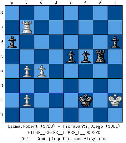 Last move : 0-1 2024 November 11 19:4:35 [Event "FICGS__CHESS__CLASS_C__000320"] [Site "FICGS"] [Date "2024.03.05"] [Round "1"] [White "Csoma,Robert"] [Black "Fioravanti,Diego"] [Result "0-1"] [WhiteElo "1728"] [BlackElo "1981"] 1.e4 c6 2.d4 d5 3.Nc3 g6 4.Nf3 Bg7 5.Be2 dxe4 6.Nxe4 Nd7 7.Be3 Ngf6 8.Nc3 O-O 9.Qd2 Nd5 10.Nxd5 cxd5 11.O-O Nf6 12.Bh6 Qb6 13.Bxg7 Kxg7 14.Rab1 Ne4 15.Qd3 Bf5 16.Qb5 Qxb5 17.Bxb5 Nd6 18.Ba4 Rac8 19.Rfe1 Rc7 20.Re2 Bg4 21.Re3 Nf5 22.Rd3 Bxf3 23.gxf3 Rc4 24.Bb3 Rxd4 25.Rxd4 Nxd4 26.Kg2 Nxb3 27.axb3 Rc8 28.c3 g5 29.Kg3 e5 30.Ra1 a6 31.Rd1 Rd8 32.h4 Kg6 33.hxg5 Kxg5 34.Rh1 h6 35.Re1 f6 36.b4 Kf5 37.Rh1 Rg8+ 38.Kh3 Kf4 39.Rd1 Kxf3 40.Rxd5 Rg1 41.Rd3+ Kxf2 42.Rd2+ Kf3 43.Rd3+ Ke4 44.Rd7 f5 45.Kh2 Rg5 46.Rxb7 Kf3 47.c4 Kf2 0-1 Follow this game move after move (download)Whoever sees no other aim in the game than that of giving checkmate to one's opponent will never become a good Chess player. (Euwe) Wenn ich Weiß habe gewinne ich weil ich Weiß habe, wenn ich Schwarz habe gewinne ich weil ich Bogoljubov bin. (Efim Bogoljubov) Fischer es el jugador mas fuerte del mundo. De hecho, el jugador mas fuerte que jamas haya existido. (Larry Evans) Echiquier : carré parfait, comme la Jérusalem nouvelle décrite par l'auteur de l'Apocalypse, huit cases sur huit, exaltation du chiffre 4, symbole du cosmos aux quatre horizons... où le noir et le blanc, l'ombre et la lumière, le mal et le bien s'entremêlent et se conjuguent. (Robert Couffignal, Le Gambit du poète) CHESS, n. f. [echecs, Fr.] A nice and abstruse game, in which two sets of puppets are moved in opposition to each other. (Dr Samuel Johnson, A Dictionary Of The English Language, 1755)