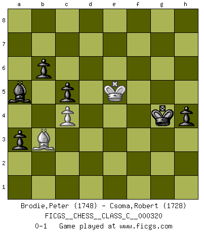 Last move : 0-1 2024 December 28 14:41:8 [Event "FICGS__CHESS__CLASS_C__000320"] [Site "FICGS"] [Date "2024.03.05"] [Round "1"] [White "Brodie,Peter"] [Black "Csoma,Robert"] [Result "0-1"] [WhiteElo "1748"] [BlackElo "1728"] 1.Nf3 d6 2.d4 c6 3.Bf4 g6 4.Nc3 Bg7 5.e3 Qc7 6.Be2 e5 7.dxe5 dxe5 8.Bg3 Ne7 9.O-O Bg4 10.h3 Bxf3 11.Bxf3 O-O 12.Qe2 Na6 13.Rad1 Rad8 14.Rxd8 Rxd8 15.Rd1 Nb4 16.a3 Nbd5 17.Qc4 Nxc3 18.bxc3 Rxd1+ 19.Bxd1 Nd5 20.e4 Nb6 21.Qd3 Bf8 22.f3 Bxa3 23.Bf2 Nc8 24.c4 Be7 25.Qd2 Qd6 26.Qxd6 Bxd6 27.c3 Ba3 28.Bg3 f6 29.f4 exf4 30.Bxf4 Bb2 31.Bg4 Ne7 32.Bd2 Kg7 33.Kf2 f5 34.exf5 gxf5 35.Bf3 Kf6 36.h4 a5 37.Bg5+ Ke6 38.Bd2 Ng6 39.g3 Kd7 40.Ke3 a4 41.Bd1 a3 42.Bb3 c5 43.Kf3 Ke6 44.Ke3 Ke5 45.Kd3 f4 46.gxf4+ Nxf4+ 47.Bxf4+ Kxf4 48.h5 Kg5 49.Ba2 Kxh5 50.Ke4 Bxc3 51.Kd5 b6 52.Kc6 Ba5 53.Kd5 Kg4 54.Ke5 h5 55.Bb3 h4 0-1 Follow this game move after move (download)We must make sure that Chess will not be like a dead language, very interesting, but for a very small group. (Sytze Faber) Im Wettkampf zwischen starken Meistern kommen Fehler sehr selten vor, deshalb ist es mit bloßem Warten nicht getan. (José Raúl Capablanca) Tu sabes que vas a perder. Aún cuando tenía la ventaja, yo sabía que iba a perder. - al estar jugando con Fischer (Andrew Soltis) Les écrivains ont utilisé les échecs pour analyser les côtés extrêmes de la nature humaine. Dans ce cadre, les échecs offrent un champ d'expérimentation idéal. Mais on pourrait faire la même chose avec la peinture. Et là, en vous référant à Van Gogh, vous ne tirerez pas de conclusion définitive sur les peintres. (Gary Kasparov) I don't believe in psychology. I believe in good moves. (Bobby Fischer)