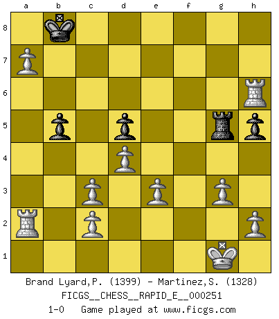 Last move : 1-0 2024 May 9 22:13:15 [Event "FICGS__CHESS__RAPID_E__000251"] [Site "FICGS"] [Date "2024.03.09"] [Round "1"] [White "Brand Lyard,Paul"] [Black "Martinez,Silvio"] [Result "1-0"] [WhiteElo "1399"] [BlackElo "1328"] 1.d4 d5 2.Bf4 Nf6 3.Bg5 h6 4.Bxf6 exf6 5.e3 Nc6 6.Bb5 Bd7 7.Bxc6 Bxc6 8.Nf3 Qd7 9.O-O O-O-O 10.Nc3 g5 11.Re1 a6 12.a4 b5 13.a5 Bb4 14.g3 f5 15.Ne5 Qe7 16.Nxc6 Qe6 17.Nxd8 Kxd8 18.Ra2 c6 19.Qh5 Kc7 20.Re2 Bxc3 21.bxc3 Qe7 22.f4 f6 23.fxg5 fxg5 24.Qg6 Qf8 25.Qe6 h5 26.Rf2 Kb7 27.Qd7+ Kb8 28.Rxf5 Qd8 29.Qxc6 Qc8 30.Qxc8+ Kxc8 31.Rxg5 Kc7 32.Rg7+ Kd6 33.Ra7 Rg8 34.Rxa6+ Kc7 35.Rh6 Rg5 36.a6 Kb8 37.a7+ 1-0 Follow this game move after move (download)If you aren't afraid of Spassky, then I have removed the element of money. (Jim Slater) Schach ist Leben. (Robert James Fischer) Bobby solo arroja las piezas y solas caen en las casillas correctas. (Miguel Najdorf ) Vouloir jouer aux échecs contre soi-même est aussi paradoxal que vouloir marcher sur son ombre. (Stefan Zweig) SEO proverb : Make your website optimized for human beings, not for search engines.