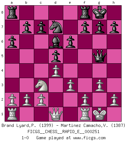 Last move : 1-0 2024 April 29 4:34:6 [Event "FICGS__CHESS__RAPID_E__000251"] [Site "FICGS"] [Date "2024.03.09"] [Round "1"] [White "Brand Lyard,Paul"] [Black "Martinez Camacho,Victor Hugo"] [Result "1-0"] [WhiteElo "1399"] [BlackElo "1387"] 1.d4 Nf6 2.Bg5 e6 3.Bxf6 Qxf6 4.e3 d5 5.Bb5+ Bd7 6.Bxd7+ Nxd7 7.Nf3 Bd6 8.O-O O-O 9.Nc3 a6 10.Ng5 Qxg5 11.g3 1-0 This chess game has been lost on time (started : 2024.03.09 21:22:36) Follow this game move after move (download)All I want to do, ever, is just play Chess. (Bobby Fischer) Viele Opfer benötigen überhaupt keine konkrete Berechnung. Es genügt sich die entstehende Position kurz vorzustellen, um uns davon zu überzeugen, dass das Opfer korrekt ist. (Mikhail Nekhemyevich Tal) El Ajedrez es un mar en el cual un mosquito puede beber y un elefante puede bañarse. (Refrán Hindú) Toute estimation doit être constamment réévaluée. (Jacob Estrin) If things go wrong, don't go with them. (Roger Babson)