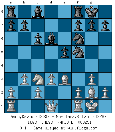 Last move : 0-1 2024 April 27 8:59:19 [Event "FICGS__CHESS__RAPID_E__000251"] [Site "FICGS"] [Date "2024.03.09"] [Round "1"] [White "Anon,David"] [Black "Martinez,Silvio"] [Result "0-1"] [WhiteElo "1200"] [BlackElo "1328"] 1.e4 e5 2.Nf3 Nc6 3.b3 Nf6 4.d3 d5 5.exd5 Qxd5 6.Nc3 Qd4 7.Nxd4 Nxd4 8.g3 Bd6 9.Bg2 c6 10.Be3 Nf5 11.O-O O-O 0-1 This chess game has been lost on time (started : 2024.03.09 21:22:36) Follow this game move after move (download)It is not a move, even the best move that you must seek, but a realizable plan. (Eugene Znosko-Borovsky) Dass jemand wie Surab Asmaiparaschwili, der selbst Elopunkte gekauft hat , Vize-Präsident der Fide werden konnte, sagt schon einges über den Zustand dieser Organisation aus. (Joel Lautier) Cuando la partida de Ajedrez termina, el Peón y el Rey regresan a la misma caja. (Irish saying) Aucun coup ne doit être joué sans but. (Pedro Damiano) All maxims have their antagonist maxims; proverbs should be sold in pairs, a single one being but a half truth. (William Mathews)