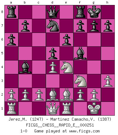 Last move : 1-0 2024 May 8 7:13:56 [Event "FICGS__CHESS__RAPID_E__000251"] [Site "FICGS"] [Date "2024.03.09"] [Round "1"] [White "Jerez,Miriam"] [Black "Martinez Camacho,Victor Hugo"] [Result "1-0"] [WhiteElo "1247"] [BlackElo "1387"] 1.e4 c6 2.Nf3 d5 3.exd5 cxd5 4.d4 Bf5 5.Nc3 e6 6.Bb5+ Nd7 7.O-O Ngf6 8.Re1 Bb4 9.Bd2 O-O 10.h3 a6 11.Be2 Ne4 12.Nxe4 1-0 This chess game has been lost on time (started : 2024.03.09 21:22:36) Follow this game move after move (download)Man is a frivolous, a specious creature, and like a Chess player, cares more for the process of attaining his goal than for the goal itself. (Dostoyevsky) Ich kenne keine einzige Person, die behaupten würde, Garri Kasparow sei ein guter Mensch (Nigel Short) Hay jugadores fuertes y personas amables y yo soy un jugador fuerte. (Bobby Fischer) Le jeu d'échecs est comme rejeté hors du temps. (Antoine de Saint-Exupéry) Life is pain my dear and anyone who says otherwise is selling something. (Princess Bride)