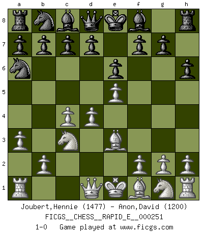 Last move : 1-0 2024 April 24 13:37:41 [Event "FICGS__CHESS__RAPID_E__000251"] [Site "FICGS"] [Date "2024.03.09"] [Round "1"] [White "Joubert,Hennie"] [Black "Anon,David"] [Result "1-0"] [WhiteElo "1477"] [BlackElo "1200"] 1.e4 Nf6 2.e5 Nd5 3.d4 e6 4.c4 Nb4 5.a3 N4a6 6.Nc3 h6 7.Be3 1-0 This chess game has been lost on time (started : 2024.03.09 21:22:36) Follow this game move after move (download)The combination player thinks forward; he starts from the given position, and tries the forceful moves in his mind. (Emanuel Lasker) Ich verachte die Medien. (Robert James Fischer) Mis oponentes también hacen buenas movidas. A veces yo no tomo esas cosas en consideración. (Bobby Fischer) Pour se monter efficace, un Cavalier a besoin d'avant-postes ! Les Cavaliers font les meilleurs bloqueurs de pions passés. Man with more than one clock never knows what time it is. (Chinese thought)