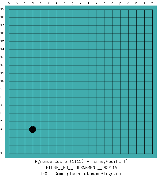 Last move : 1-0 2024 April 19 14:3:27 [Event "FICGS__GO__TOURNAMENT__000116"] [Site "FICGS"] [Date "2024.03.13"] [Round "1"] [Black "Agronow,Cosmo"] [White "Forme,Vocihc"] [Result "1-0"] [Rating 1 "1113"] 1.d4 1-0 This go game has been lost on time (started : 2024.03.13 8:16:29) Follow this game move after move (download)Keep away from thickness. (Anonymous) There are more things in heaven and earth than practically anywhere else. (Unknown)