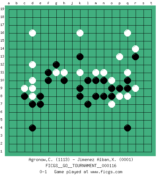 Last move : 0-1 2024 May 21 20:32:22 [Event "FICGS__GO__TOURNAMENT__000116"] [Site "FICGS"] [Date "2024.03.13"] [Round "1"] [Black "Agronow,Cosmo"] [White "Jimenez Alban,Xavier Miguel"] [Result "0-1"] [Rating 1 "1113"] [Rating 2 "0001"] 1.d4 d16 2.q4 q16 3.r13 r14 4.q10 d10 5.e8 d8 6.d7 c9 7.c8 d9 8.e7 p13 9.m10 q11 10.k13 k16 11.g12 d12 12.f10 o10 13.o9 m11 14.l10 n9 15.n10 n11 16.n8 m9 17.m8 l9 18.k9 l8 19.l7 k11 20.k8 h11 21.h10 g11 22.f11 r9 23.q9 q8 24.p9 p8 25.o8 o7 0-1 Follow this game move after move (download)Knight's moves win running battles. (Anonymous) Whoever said the pen is mightier than the sword obviously never encountered automatic weapons. (US General Douglas MacArthur)