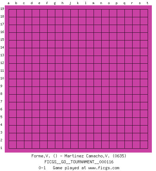 Last move : 0-1 2024 April 12 13:24:34 [Event "FICGS__GO__TOURNAMENT__000116"] [Site "FICGS"] [Date "2024.03.13"] [Round "1"] [Black "Forme,Vocihc"] [White "Martinez Camacho,Victor Hugo"] [Result "0-1"] [Rating 2 "0635"] 0-1 This go game has been lost on time (started : 2024.03.13 8:16:29) Follow this game move after move (download)Don't overlook the edge of the board. (Anonymous) The production of too many useful things results in too many useless people. (Karl Marx)