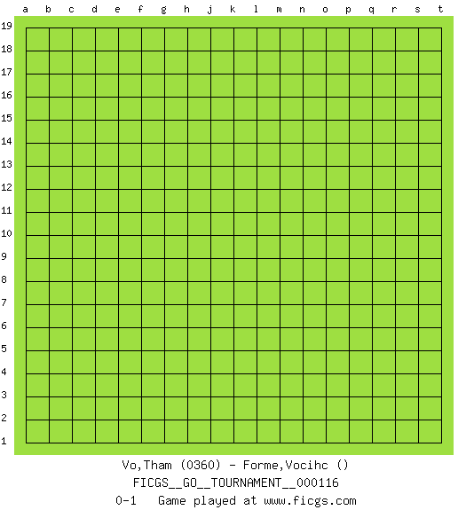 Last move : 0-1 2024 April 12 13:24:34 [Event "FICGS__GO__TOURNAMENT__000116"] [Site "FICGS"] [Date "2024.03.13"] [Round "1"] [Black "Vo,Tham"] [White "Forme,Vocihc"] [Result "0-1"] [Rating 1 "0360"] 0-1 This go game has been lost on time (started : 2024.03.13 8:16:29) Follow this game move after move (download)Balance is not what players strike for, and if it does arise, it is in spite of them. (Pierre Audouard) Wisdom doesn't necessarily come with age. Sometimes age just shows up all by itself. (Tom Watson)
