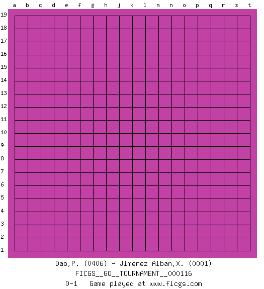 Last move : 0-1 2024 April 12 13:24:34 [Event "FICGS__GO__TOURNAMENT__000116"] [Site "FICGS"] [Date "2024.03.13"] [Round "1"] [Black "Dao,Paul"] [White "Jimenez Alban,Xavier Miguel"] [Result "0-1"] [Rating 1 "0406"] [Rating 2 "0001"] 0-1 This go game has been lost on time (started : 2024.03.13 8:16:29) Follow this game move after move (download)You can hide nothing on the goban. (Pierre Audouard) You can only get smarter by playing a smarter opponent. (Revolver, movie)