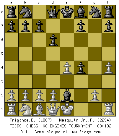 Last move : 0-1 2024 May 29 18:5:24 [Event "FICGS__CHESS__NO_ENGINES_TOURNAMENT__000132"] [Site "FICGS"] [Date "2024.03.15"] [Round "1"] [White "Trigance,Emile"] [Black "Mesquita Jr.,Fausto Monteiro"] [Result "0-1"] [WhiteElo "1867"] [BlackElo "2294"] 1.e4 e5 2.f4 exf4 3.Nf3 g5 4.h4 g4 5.Ne5 d6 6.Nxg4 Bxg4 7.Be2 Bxe2 0-1 Follow this game move after move (download)Discovered check is the dive bomber of the Chessboard. (Reuben Fine) Wenn Spassky eine Figur opfert kannst du genauso gut aufgeben. Aber wenn Tal eine Figur opfert, spiel weiter. Er könnte noch eine weitere opfern, und dann ... wer weiß? (Miguel Najdorf) El Ajedrez hace al hombre ser mas sabio y ver mas claro. (Vladimir Putin) Lorsque vous vous retrouvez devant une position atroce, ne tendez pas un ultime piège dérisoire avec l'intention d'abandonner si l'adversaire le déjoue ! Faites-vous plutôt un devoir de résister comme si votre vie en dépendait. Jouez le coup qui vous déplairait au centuple si vous étiez dans la peau de votre tortionnaire ! Luck never made a man wise. (Seneca, Letters to Lucilius)